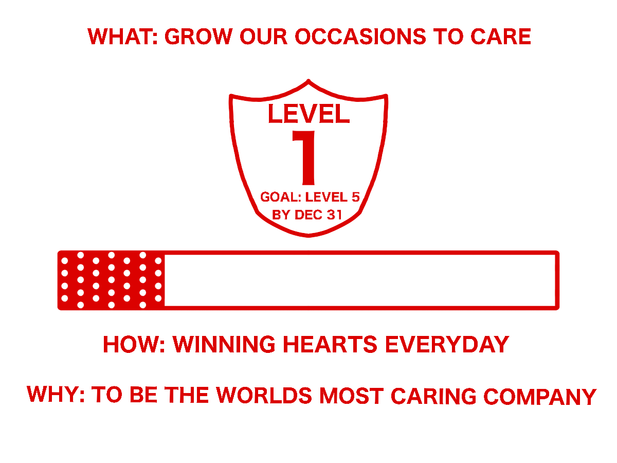 Our GOTC scorecard tracks the progress we’ve made towards increasing the number of repeat visits by customers within a year. Our goal is to reach level 5 by December 31st.